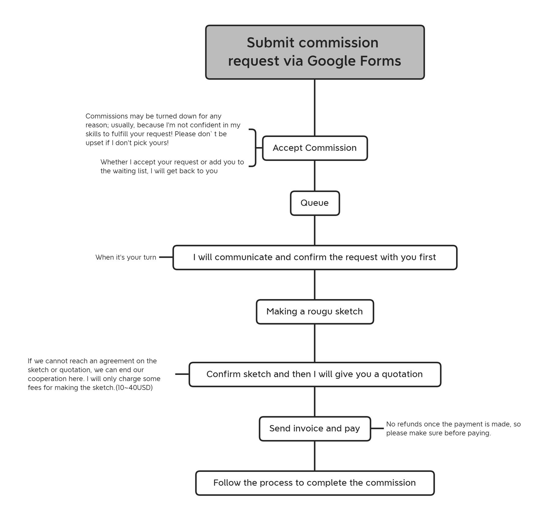Currently only open for single character commission※ I accept commissions in batches, so turnaround time may vary between 1 to 4 months, depending on my schedule.※ If you have a deadline for the commission, please state it. (Additional charges may apply) Otherwise, I will take my time.※ It will take around 1 -12 weeks for me to finish your commission from the day the sketch is approved, based on how detailed the character and the queue number.※ I will post all my commission progress on my Trello every week.